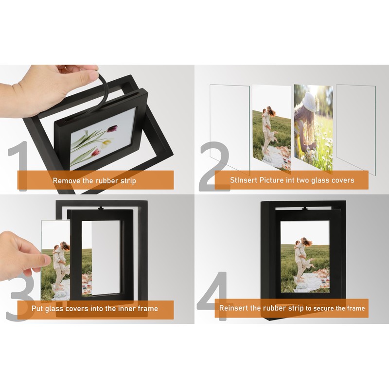 • Rotating & Floating & Versatility: With an innovative swivel mechanism on each side, the inner frame is securely held by the outer frame, allowing you to insert two back-to-back photos for a double-sided display. This design enables a 360-degree rotation for a dynamic viewing experience. You can also insert smaller photos to create a floating effect, adding a unique and versatile touch.