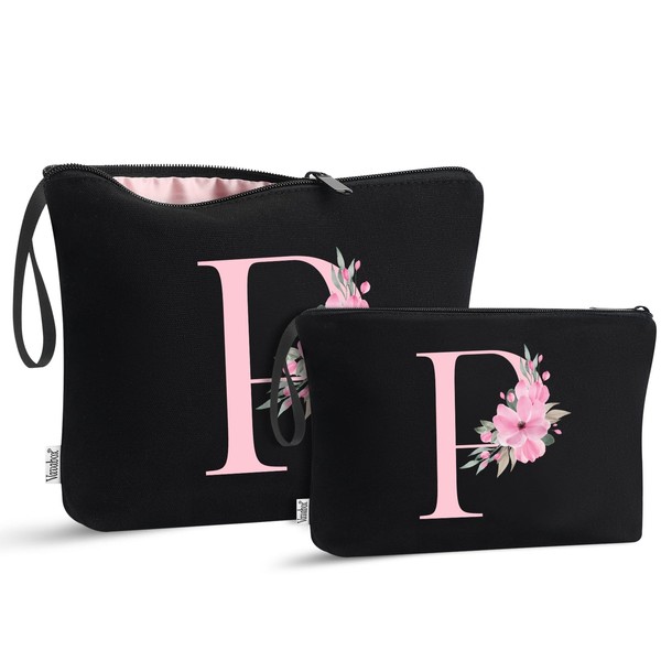 Vavabox 2 Pcs Initial Toiletry Bags Set,Birthday Gifts for Women,Travel Portable Toiletry Bag with Handle (P, Black)