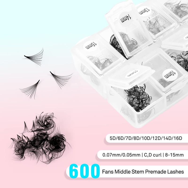 - Cost-effective:VAVALASH Premade loose fans come in packages of 600 fans/box,equivalent to 5 boxes of 12 rows of premade fans.Each box has 8 separate grids.(8mm/9mm/10mm/15mm 50 Fans per grid, 11mm/12mm/13mm/14mm 100 Fans per grid).