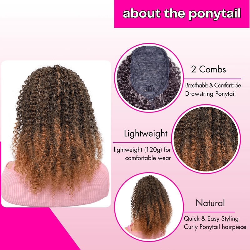- ✔ Secure & Adjustable Drawstring Ponytail– Kinky curl Drawstring Ponytail Extension Easy-to-use elastic band ensures a snug fit on most hair types, allowing quick updo styles without clips or glue.