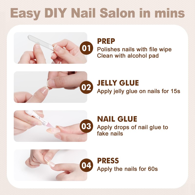 • QUICK SALON IN SECONDS: Using press on nails with jelly glue, the perfect replacement for nail polish, no need to wait for drying, get a salon-like manicure effect in a few minutes, Save time at the nail salon and have a nail party with your friends