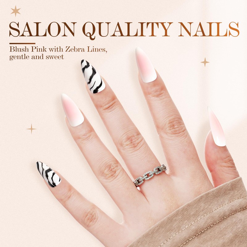 - 24 NAILS IN 12 SIZES: The Blush Pink with Zebra Lines Long Stilett Nails, set with Nano glass file, jelly gels and pink glue, with 12 different sizes for various nail sizes ensure a totally custom fit