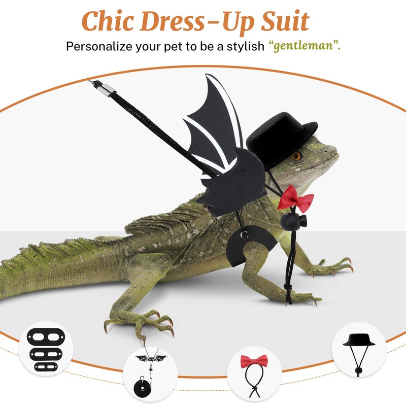 - Chric Dress-Up Suit: Felt hat and high-elastic bow tie are added to make your lizard look better. Personalize your pet to be a stylish "gentleman".