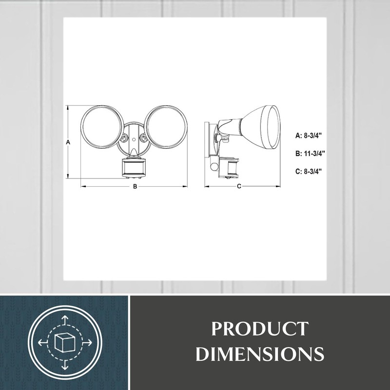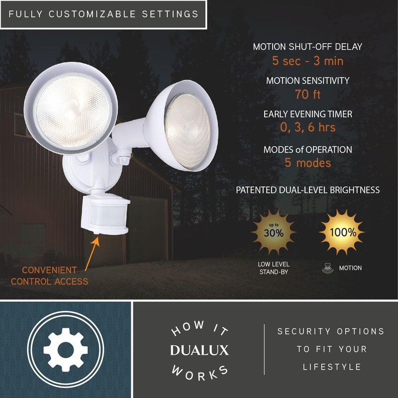 This 2-light outdoor motion sensor security light provides low-level approximately 30% ambient lighting throughout the night and bright 100% high level when motion is detected. The light heads and sensor are fully adjustable to keep your home’s exterior brighter at dusk, dimmer at night, and instantly bright when motion is detected. Customize your lighting options with 5 modes of operation plus adjustable motion sensor sensitivity. Suitable for wall or eave mounting with a wide detection area of 180 degrees and 70 feet. This Dualux security flood light expands the functionality, safety, and security of your home’s outdoor spaces with bright, reliable light when and where it is needed most.