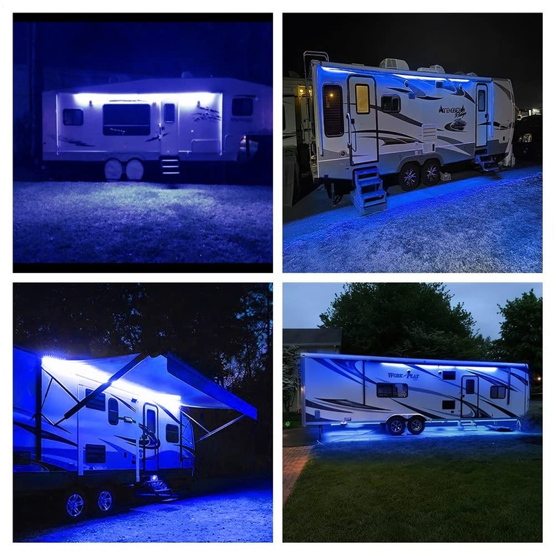 - 【UPGRADED 20FT RV AWNING LIGHTS】: Full kit for your RV, no other accessories need, our kit included 1 x 6m(20ft) Blue LED Strip Lights + 2M/6.56FT extension cable, 10 pcs 3M tape hooks and 10pcs led strip clips and screws, The RV Camper led strip light is an ideal gift for your friends or family on birthday, Christmas or party, especially for rv lovers.