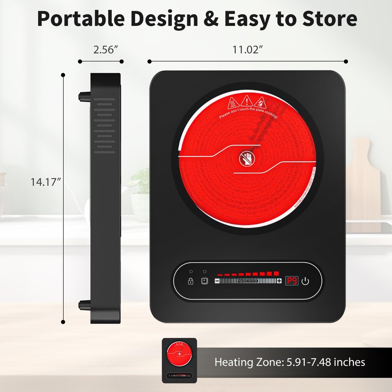 - Safe & Versatile:This electric stove top can be time independently with digital timer to adjust the temperature, power, cooking mode. Portable cooktop this way you can manage your cooking time efficiently and do other things without worry. single electric burner has multiple safety protection such as child safety lock, overheating protection, Double ring heating and residual heat warning.