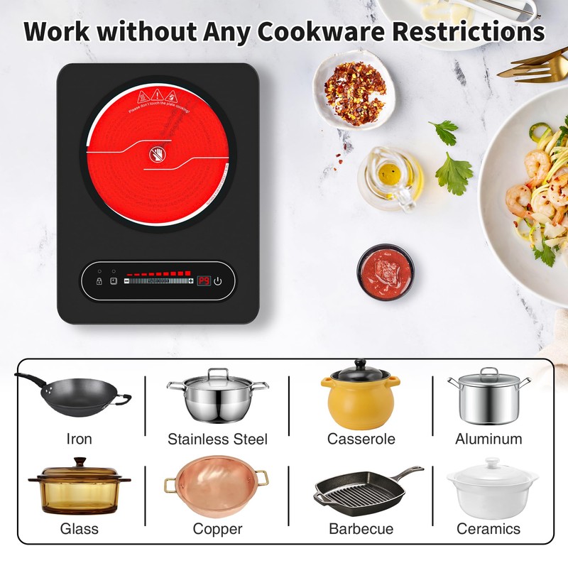 - Better than induction cooktop:This is 110V Portable single cooktop ,not an induction cooker. Electric stove top burner do not emit high-frequency radiation. It is superior to induction cooktop. It can protect pregnant women from electromagnetic radiation and they can use it with peace of mind. When cooking with an Electric cooktop for overheat protection, residual heat indication, auto shut-off ,Safety Lock,helping you create a healthy kitchen environment.