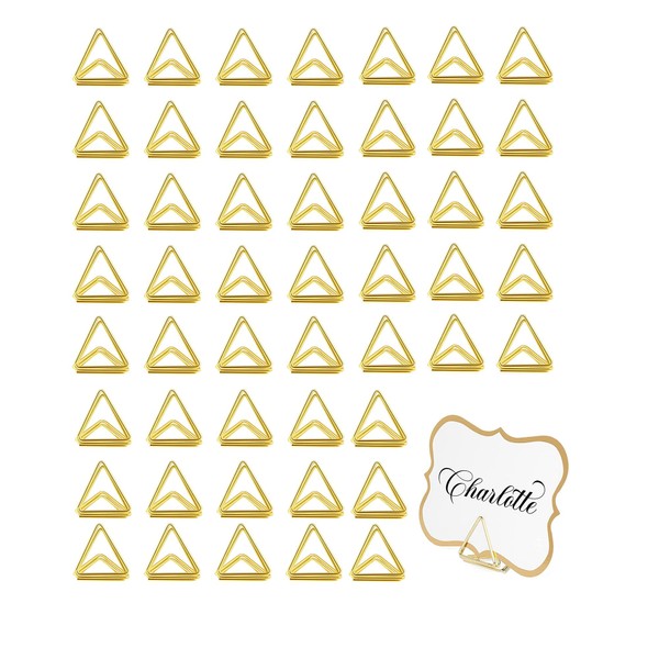 VBNZBK 50 Pcs Triangle Place Card Holder Table Number Holder Picture Stand Menu Holder with Gold Foil Trim for Wedding Place Cards (Gold)