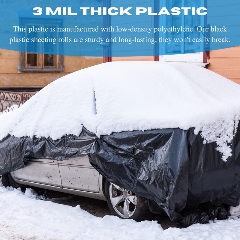 - 3 Mil Thick Plastic - This plastic is manufactured with low-density polyethylene. Our Black plastic sheeting rolls are sturdy and long-lasting; they won't easily break or shred.