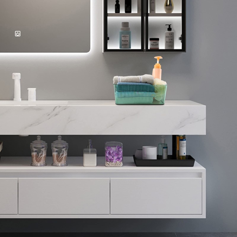 Vcansay clear plastic storage basket bin, stylish and elegant appearance, moderate size, can be perfectly used for dressing table organizing cosmetics, skin care products, combs, cosmetic brushes, both practical and beautiful. It is also suitable for other places with storage needs, such as living room desktop, kitchen cabinets, bathroom countertops, study drawers, etc.