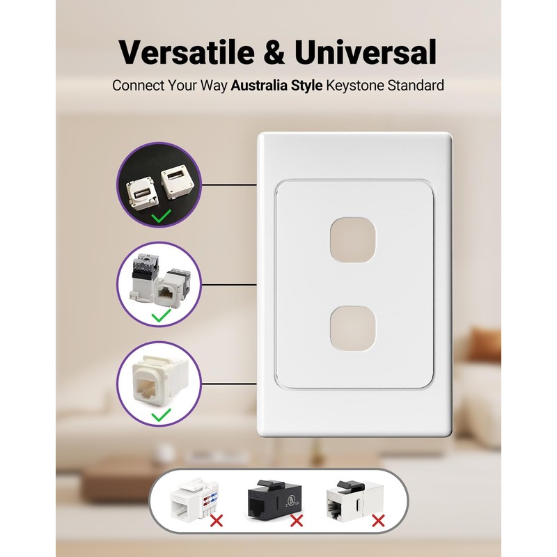• VERSATILE COMPATIBILITY & EXPANSION: Aussie-standard Keystone wall plates fit RJ45, HDMI, USB, and coaxial keystone couplers or jacks. Mix, match, and upgrade with ease—ideal for home theater, office network, or low voltage structured cabling needs