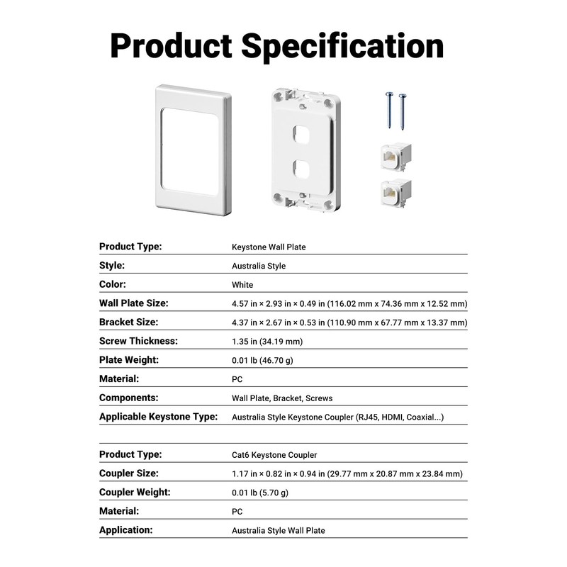 • WHAT YOU WILL GET: 1 x Australia Style Keystone Wall Plate 2 Port + 2 x Cat6 RJ45 Keystone Coupler, designed exclusively for AU-Type setups. Enjoy 18-month hassle-free customer service