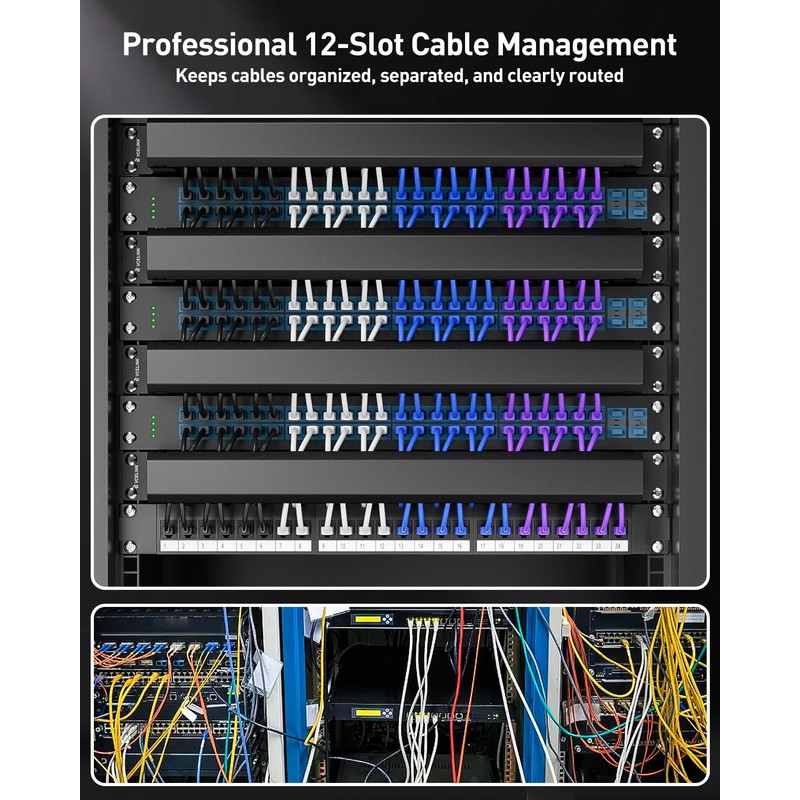 - UNIVERSAL COMPATIBILITY: Fits all standard 19" racks, network cabinets, and wall-mount systems. Each of the 12 slots accommodates multiple RJ45, HDMI, RCA, Coax, Fiber Optics cables, and more – your all-in-one solution for diverse cabling needs