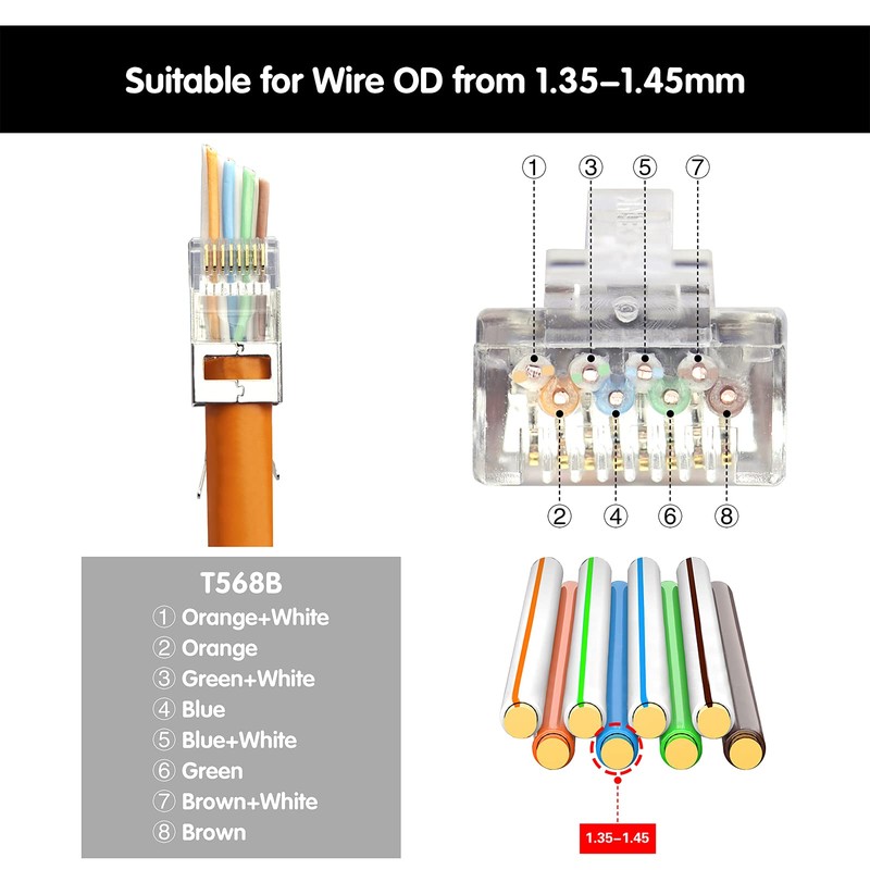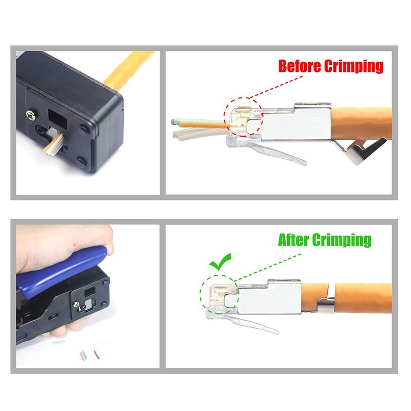- Applicability: This crimping tool RJ45 is widely compatible with 8P8C, 6P6C and 6P4C modular plug; which can be crimped both pass-through male and non-pass-through connectorsuitable for all CAT5, CAT5E, CAT6, CAT6A, CAT7, connectors.