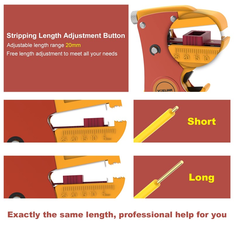 - Einstellbares Design: Der obere Einstellknopf kann die Abisolierspannung des Ger?tes ver?ndern, die je nach den Spezifikationen und Materialien der verschiedenen Dr?hte eingestellt werden kann. In der Abisolier?ffnung befindet sich ein L?ngeneinsteller, mit dem Sie eine einheitliche Kabell?nge erhalten. Die verschiedenen L?ngeneinstellungen auf beiden Seiten der Abisolier?ffnung sind markiert, um Kabel in geeigneten L?ngen abzuisolieren.