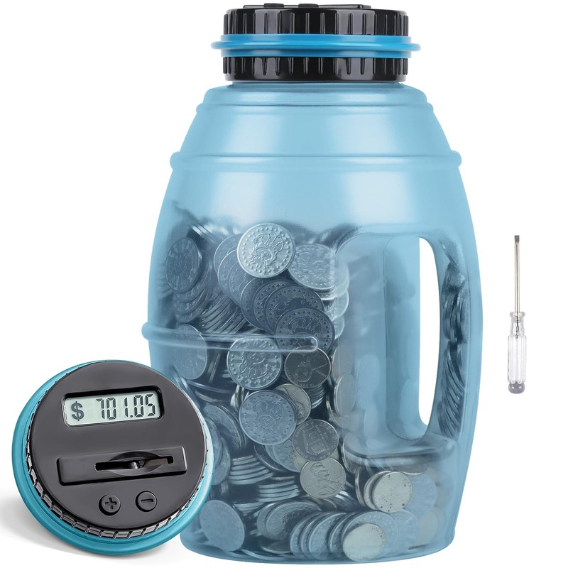 - Know The Amount At Any TimeCoin-counting money jar with legible LCD screen allows you to see the amount of coins quickly and exactly. The digital coin counter is made of ABS plastic. Much more sturdy than glass/ceramic piggy bank.