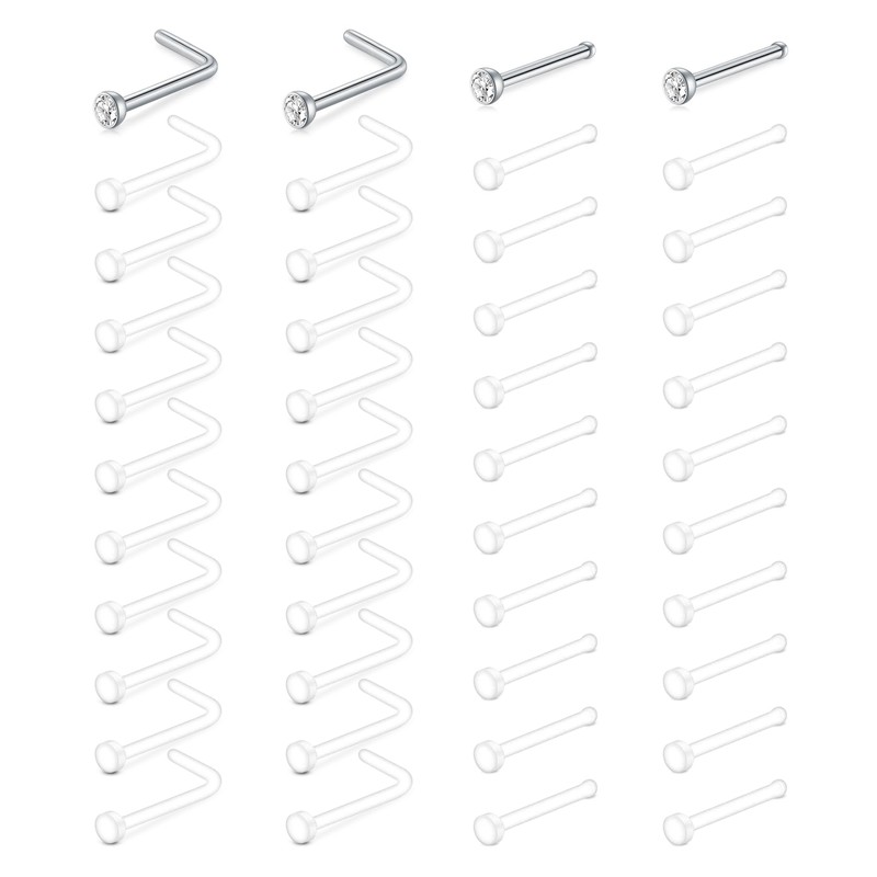 - Package: 40pcs clear nose studs with flat top, 4pcs stainless steel nose studs