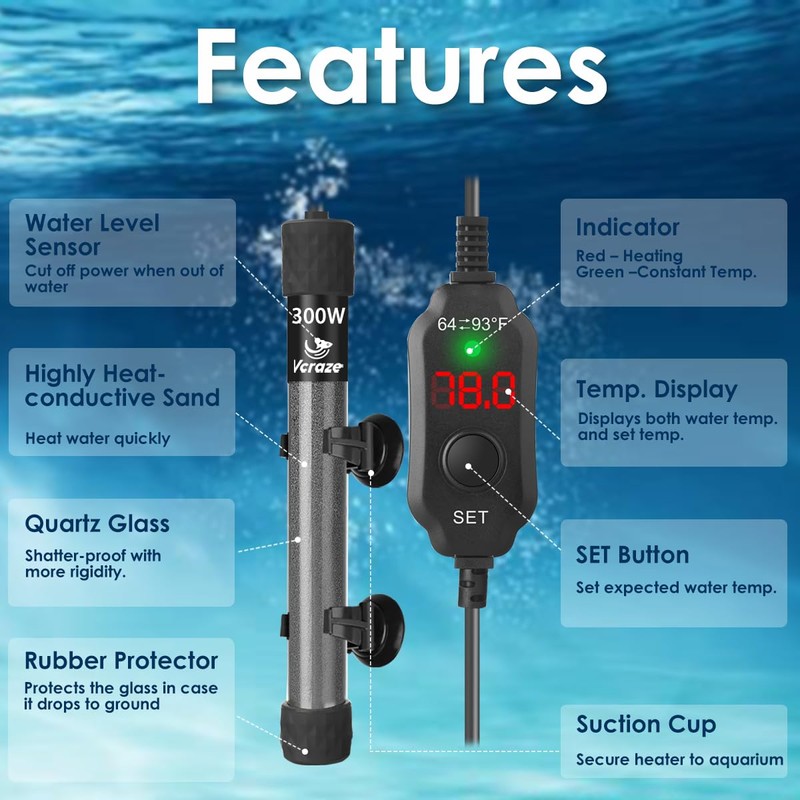 VCRAZE Super Compact 300W Fish Tank Heater, Submersible Aquarium Heater with ...