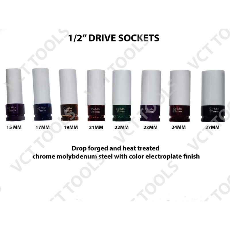 - Sizes included: 6pt 1/2" drive sockets 15mm, 17mm, 19mm, 21mm, 22mm, 23mm, 24mm, 27mm
