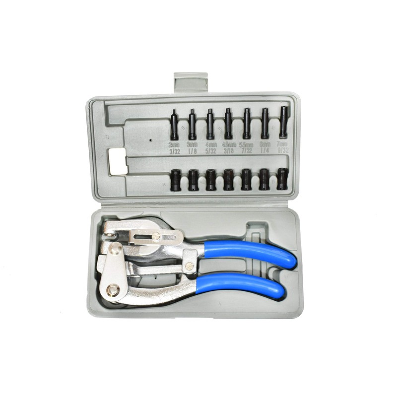 • Includes 7 sizes of punches and dies: 3/32", 1/8", 5/32", 3/16", 7/32", 1/4", 9/32", 1-pc throat depth gauge and 1-pc heavy duty storage case