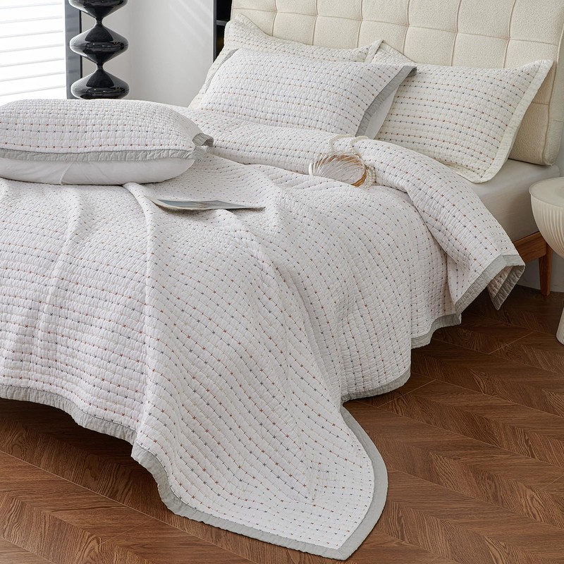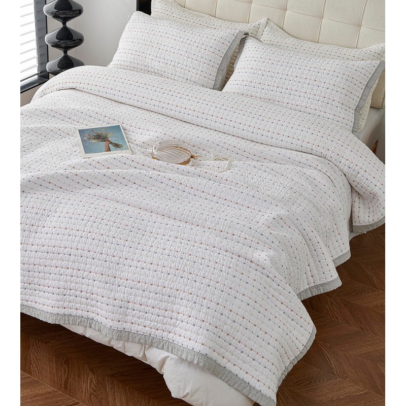 vctops Cotton Quilted Bedspread Quilt Set with 2 Pillow Shams Queen Size Stripe Embroidery Comforter Set Farmhouse Rustic Soft Lightweight Coverlet Bedding Set (White,Queen)