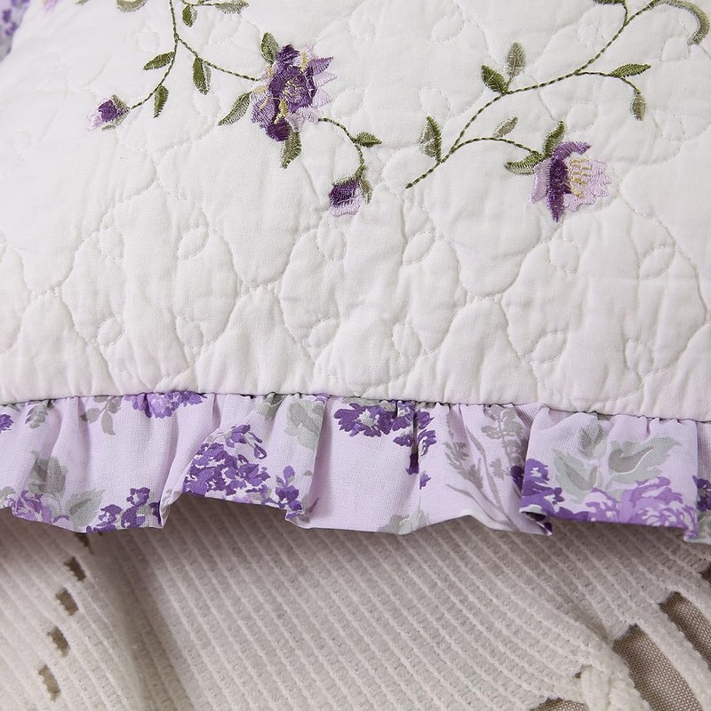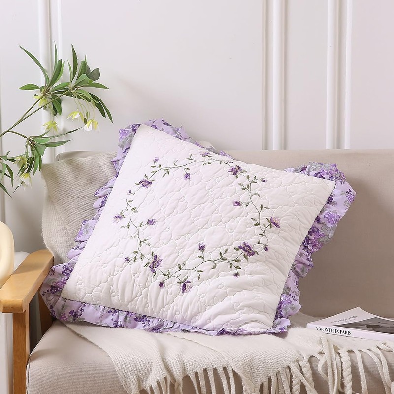 • Design: A sweet charming classic pillow covers that never goes out of style. Embroidered with wreaths of soft purple rose buds and sweet green leaves for a delicate design. The binding is made of a purple floral fabric that adds a touch of pattern. The ruffles edges give this pillow cover a feminine touch.