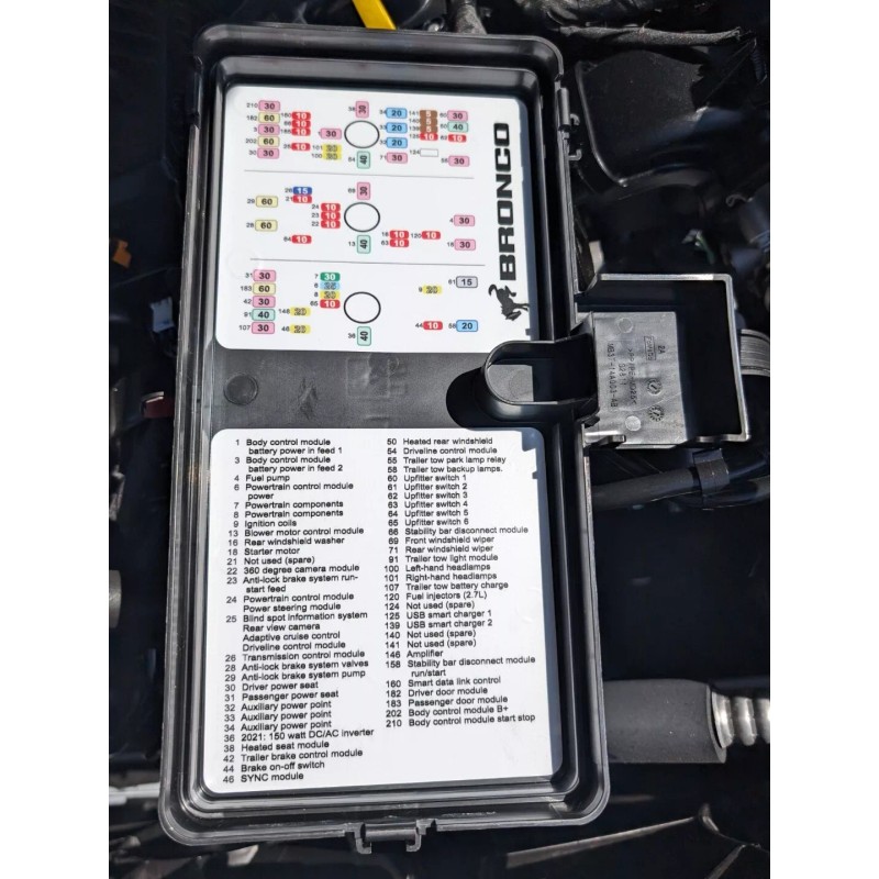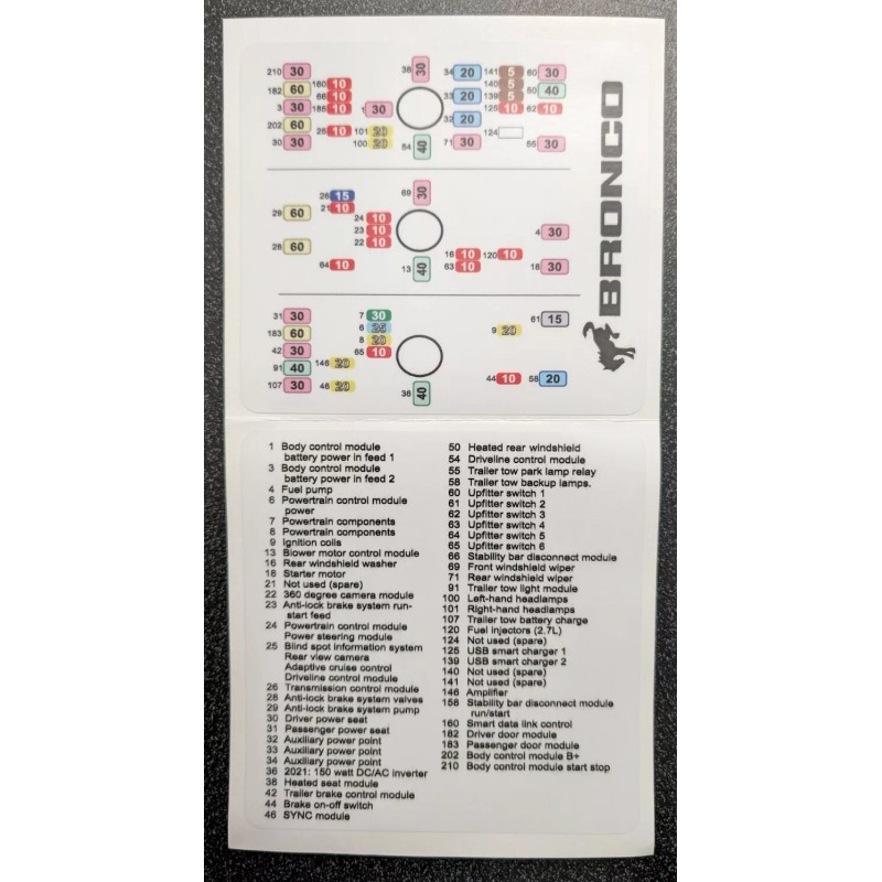 VDD Ford Bronco 2021-2024 Fuse Box Panel Diagram Lid Label / Sticker / Insert