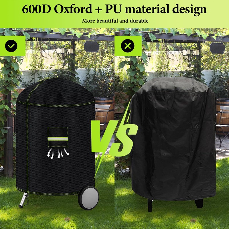 - The barbecue cover kettle grill is made of robust 600D Oxford fabric, weatherproof, waterproof, UV-resistant and tear-resistant, better thicker and more stable than conventional grill covers made of 210D, 420D and other materials.