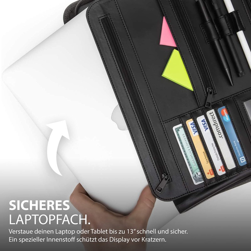 - More space for you - Inside the clipboard folder you will find numerous compartments and holders for your utensils. In addition, the generous divided inner compartment offers you the possibility to safely store your 13 inch laptop and tablet.