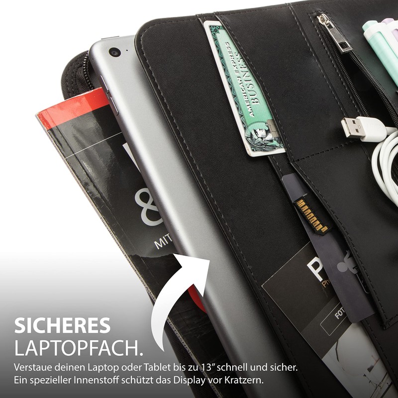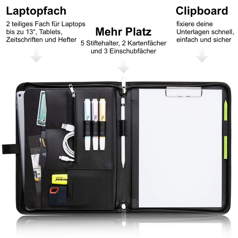 - More space for you - Inside the clipboard folder you will find numerous compartments and holders for your utensils. In addition, the generous divided inner compartment offers you the possibility to safely store your 13 inch laptop and tablet.
