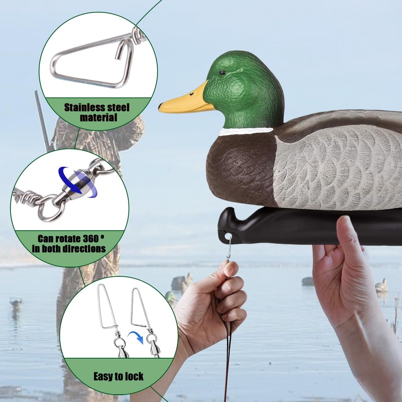 • 🦆 HEAVY DUTY STAINLESS STEEL BALL BEARING SPINNER DECOY CLIP AND CONNECTOR DESIGN: Our duck decoy weights adopt stainless steel ball bearing swivel clips, which are rust-free, high hardness, high tensile strength and more durable. They can rotate 360 ​​degrees in both directions to prevent the cable from tangling. The smooth surface allows the decoy to slide easily. In addition to using the decoy crimp to fix the connectors on both ends, a thermoplastic wrap is added to make it more secure.