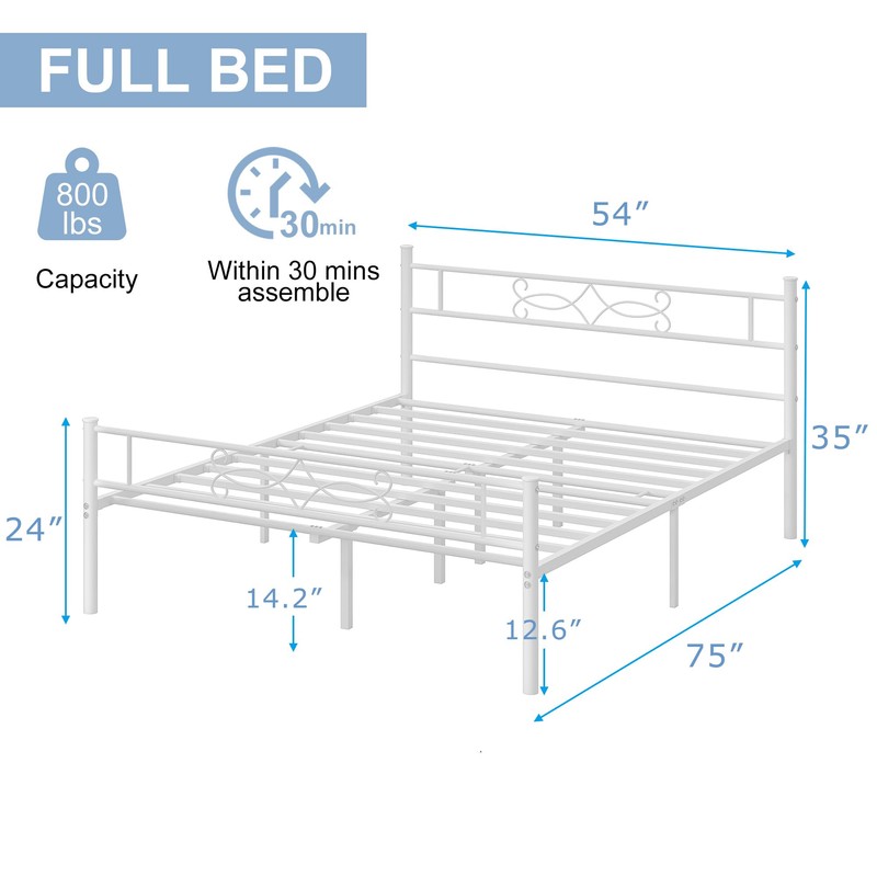 - 【Sturdy Support】With 13 pcs Updated Heavy Duty Metal Slats, 9 pcs side rails and supporting legs, this full bed is capable of holding up to 600 lbs,Providing your mattress with strong support.