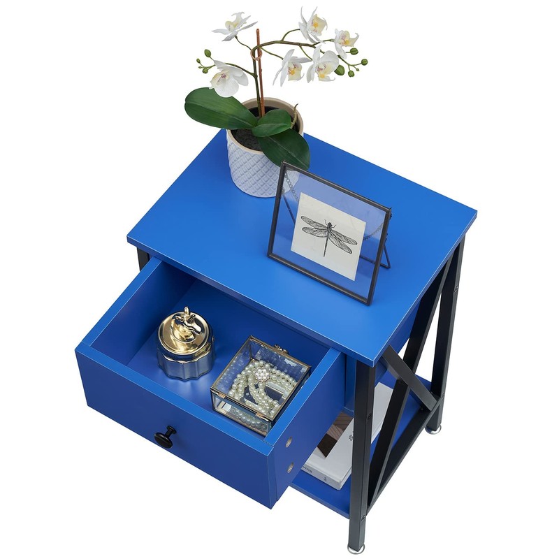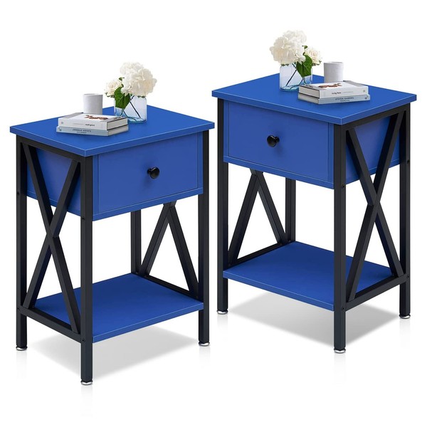 VECELO End Table X-Design Storage Shelf for Living Room Bedroom, Nightstand with Drawer, Dark Blue/Set of 2