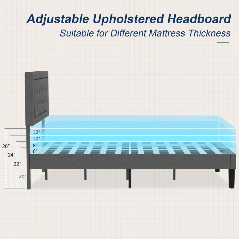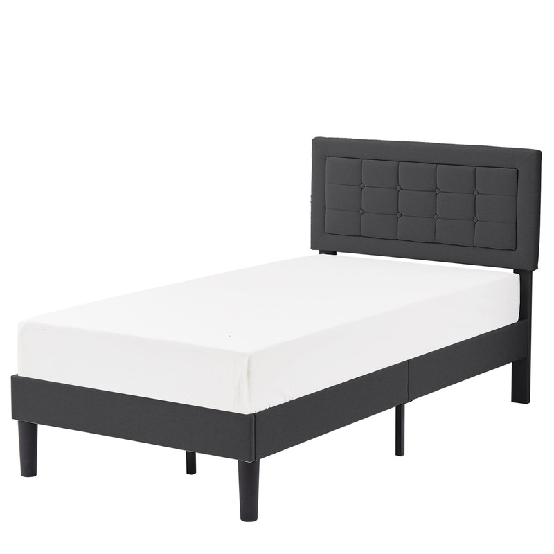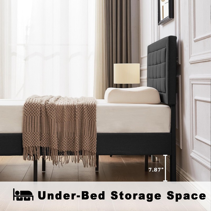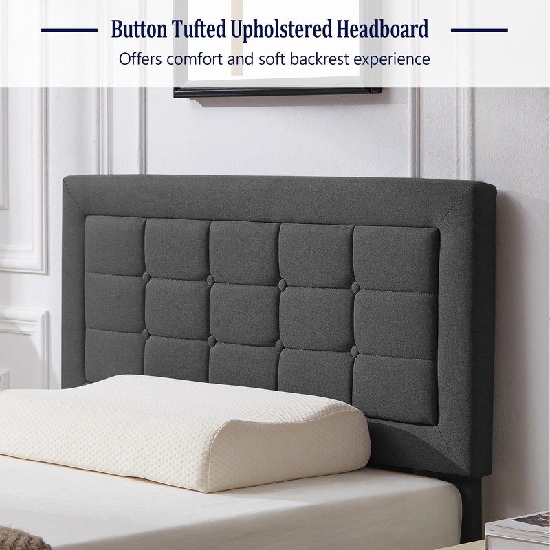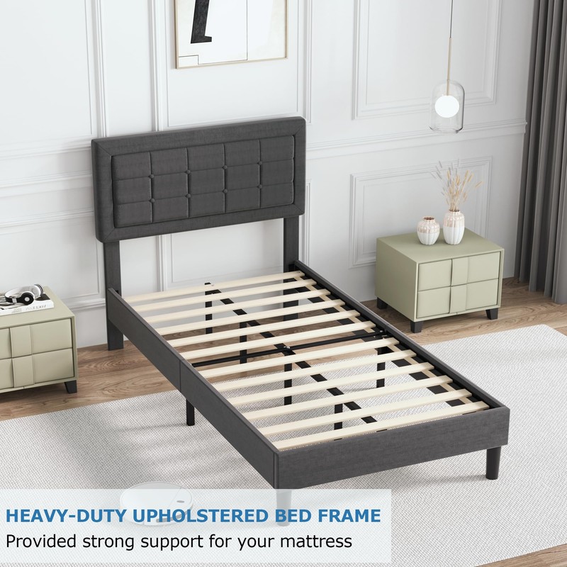 - [STYLSIH AND COMFORTABLE] - This classic square silhouette twin bed frame features Upholstered linen and tufted button headboard, making it perfect for a variety of bedroom styles. Thick and dense foam padding gives you comfortable touch.