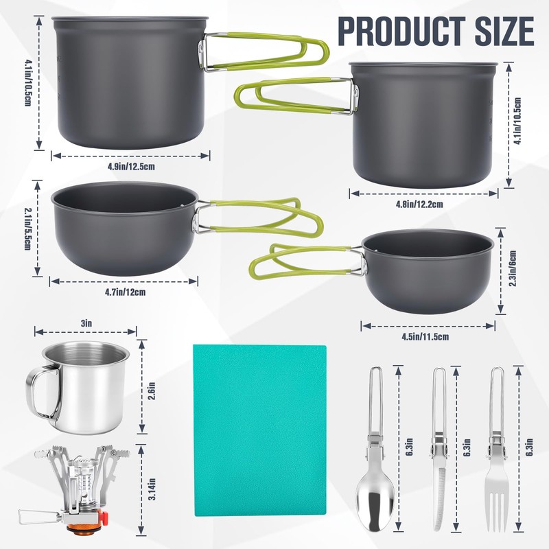 - All-in-One 16-Piece Camping Cookware Mess Kit: Designed for 2–3 people, this complete backpacking mess kit includes: 2 non-stick pots (1.2L & 1.3L), 2 mini pans (0.6L & 0.7L), 1 mini stove, 2 stainless steel cutlery sets, 2 cups, 2 cleaning cloths, and more. Perfect for couples, friends, and small families who love outdoor cooking. Whether you’re making a quick breakfast or a hearty dinner, this camping cooking set makes campfire meals fun and effortless