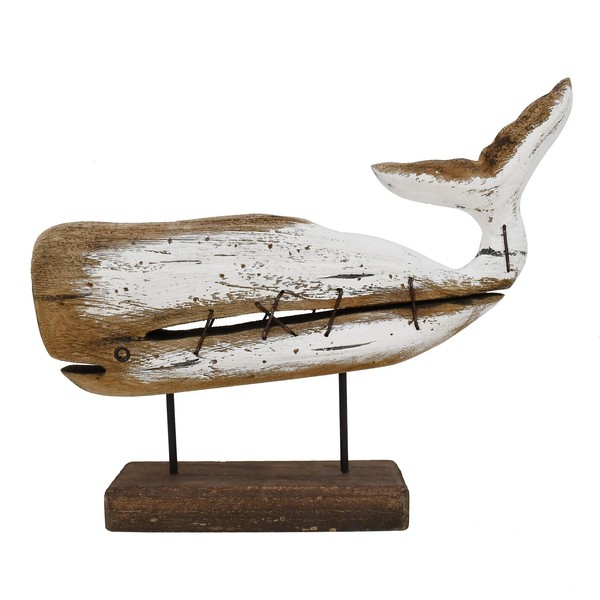 - Rustic distressed wood makes the perfect wooden art beach decor for your table centerpiece or other needs in your home decor. Beach whale statue is made from solid wood and metal material. Vintage wood whale figurine is the perfect modern farmhouse decor and nautical decor that have a beach vibe.