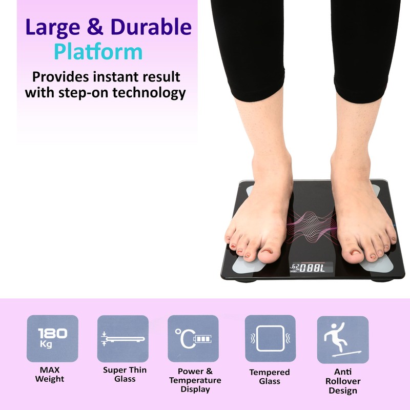 - Safety and Comfort: The scale’s 6mm tempered glass platform provides durability and safety, while the anti-slip surface ensures comfort and stability during use. The large, bright large display gives you precise measurements without the risk of slipping.
