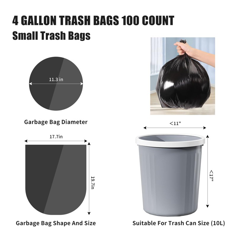 - 【 4 Gallon Trash Bag】W x H dimension: 18 x 20 inches. Fit for trash can liners in 3, 3.5, and 4 Gal. Please make sure your trash can is <11" in diameter, and <33" in circumference. If the height is > 18", the bag will not fit in your trash can.