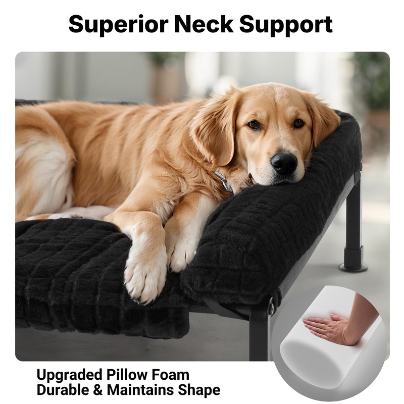 Veehoo Cooling Elevated Dog Bed with Fluffy Plush Cushion, Washable Raised Dog Beds with Removable Bolster, Breathable Mesh, No-Slip Feet, Heavy Duty Pet Cot for Large Dogs, 59 x 37 inches, Black