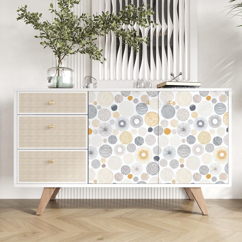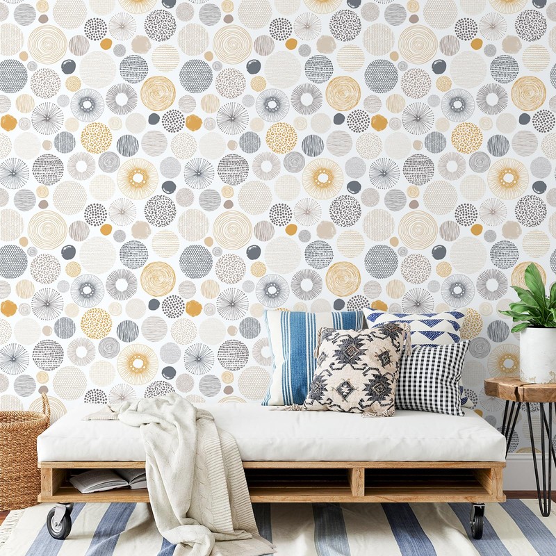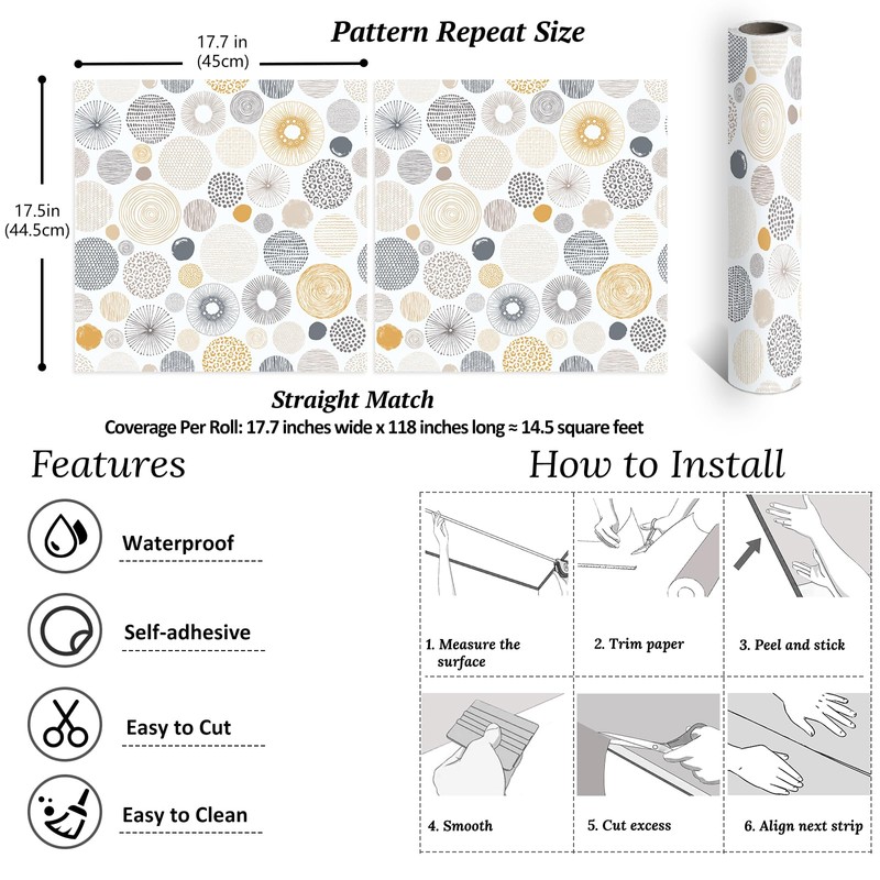 - ๐๐ซ๐จ๐๐ฎ๐๐ญ ๐๐๐ญ๐๐ข๐ฅ๐ฌ: Geometric wallpaper, pastel circle patterns, boho style, made of thick vinyl, durable. 17.7 inch wide by 118 inch long, covers 14.5 Sq. Ft. each roll, straight match