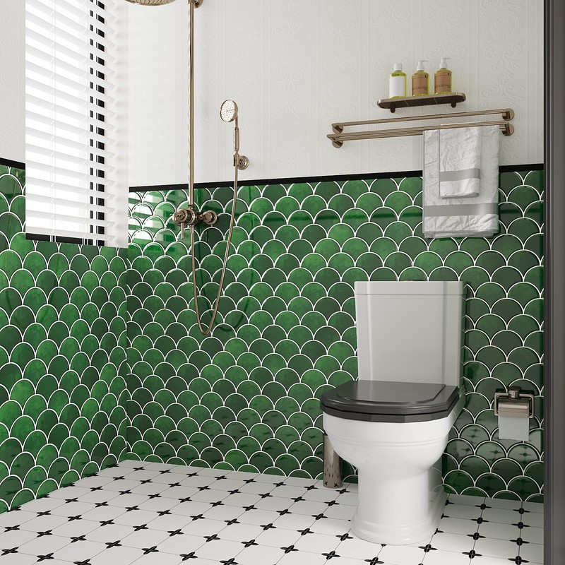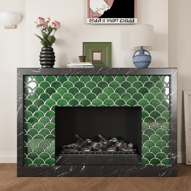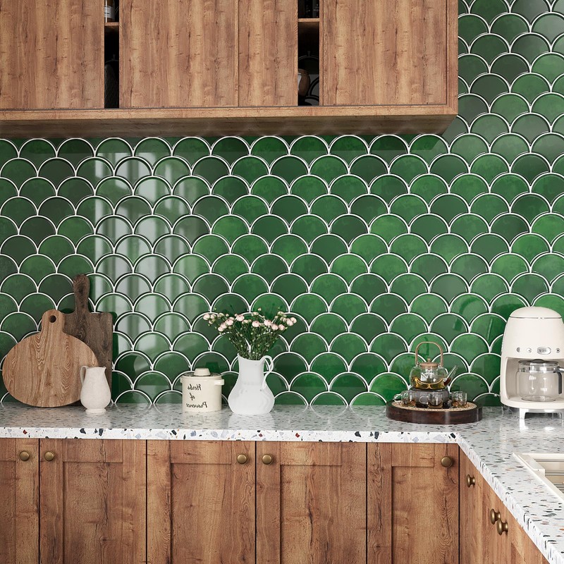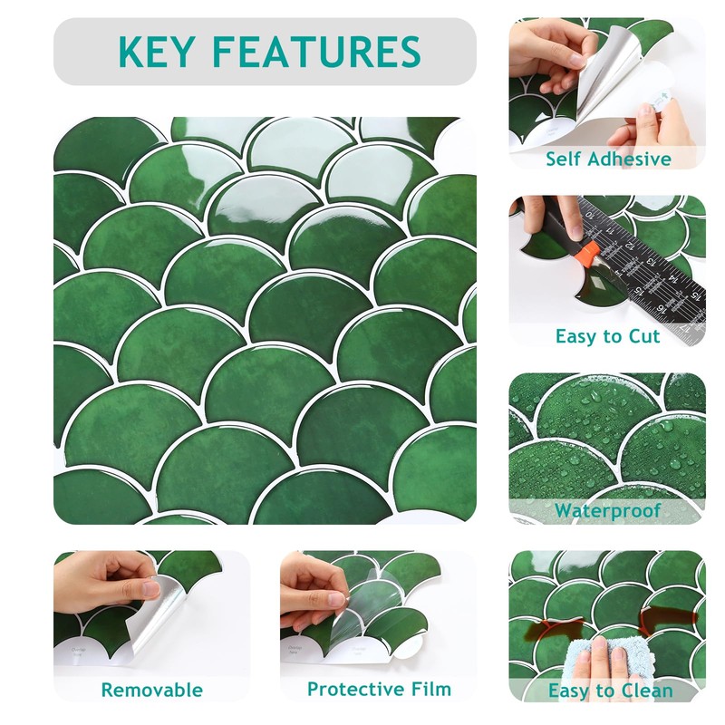 - ๐๐ซ๐จ๐๐ฎ๐๐ญ ๐๐๐ญ๐๐ข๐ฅ๐ฌ: Peel and stick backsplash, fish scale backsplash tile, vintage emerald green color, glossy finish, made of high quality vinyl, durable, flexible, light weight, 12''x12''x0.05'', 6 tiles included, 6 square feet each box