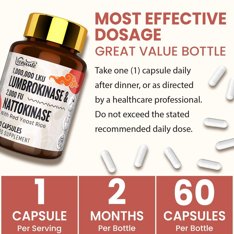 - EASY-TO-SWALLOW CAPSULES - Veenuule's Lumbrokinase supplement comes in 60 easy-to-swallow capsules, providing a two-month supply. Each capsule contains a potent serving of Lumbrokinase. Just take one capsule daily after dinner, making it a convenient and effective addition to your daily health routine.