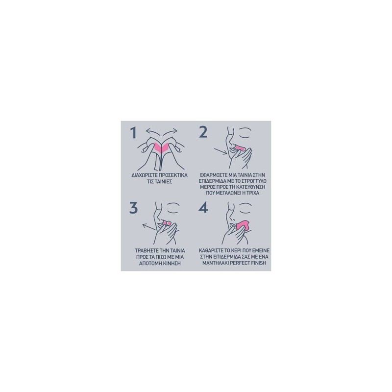 Ταινίες Κεριού: Triethylene Glycol Rosinate, Glyceryl Rosinate, Silica, Polyethylene, Parfum, Paraffinum Liquidum, Butyrospermum Parkii (Shea Butter) Extract, BHA, CI 15850, CI 77891.