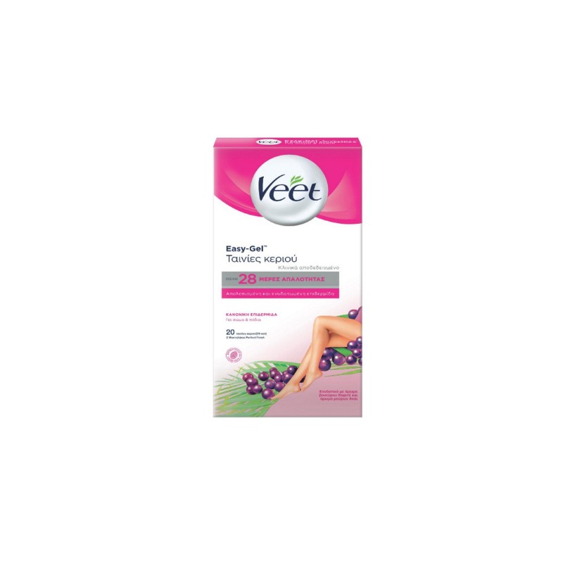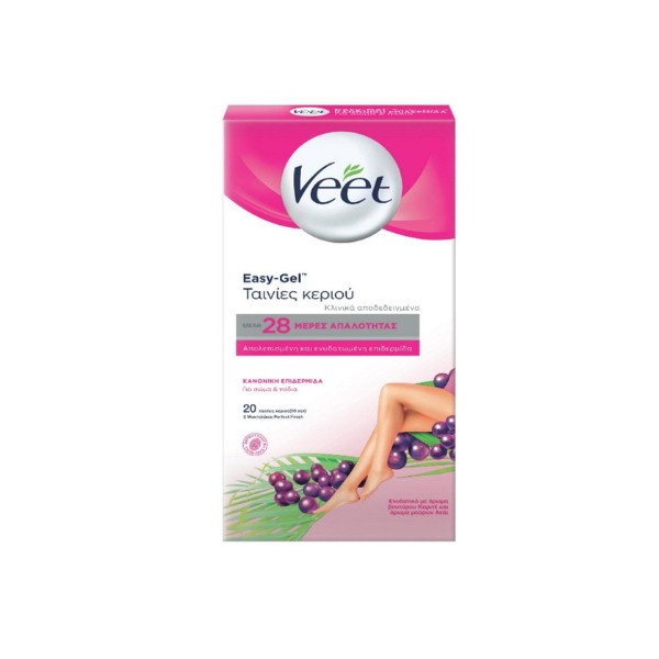 Veet Easy-Gel Body & Foot Legs Tapes for Normal Skin are cold wax strips for softness that last up to 28 days! They are specially designed with the aroma of shea butter and Akai berries. The Easy-Gel formula embraces and removes even the shortest hairs (1.55mm) from the root.