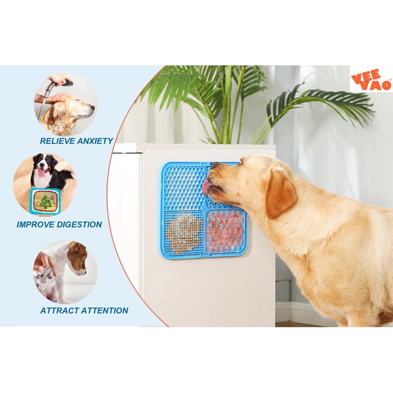 - 😊Boredom Breaker & Anxiety Reducer: VEEVAO dog lick mat help your buddy dogs calm down and reduce destructive behavior by keeping them licking to release endorphins. Four kinds of licking areas for longer and happier slow feeding. Great for stressful times like medical treatment, grooming, bathing, nail trimming, and vet visit.