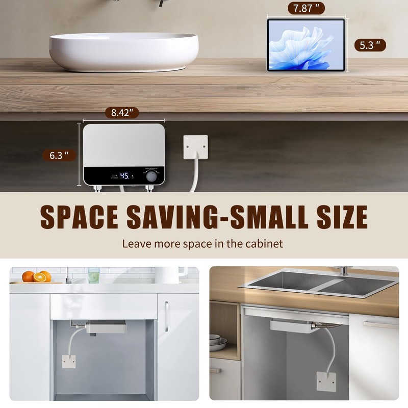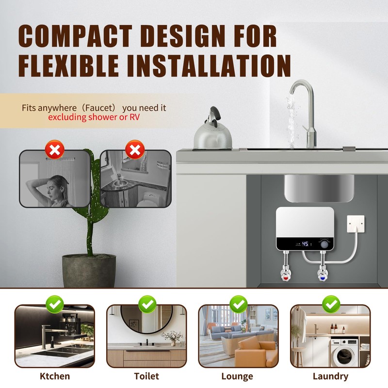 - EASY TO INSTALL - Instant water heaters are designed to be compact, even smaller than small suitcases. Make the installation of electric water heaters unrestricted. It can be installed 360 degrees in any narrow space, such as bathrooms sinks, kitchens, and laundry. Please note that this water heater is not suitable for showers or RVs. In addition, water heaters with complete electrical and water flow zones can be installed vertically or upside down according to your needs.