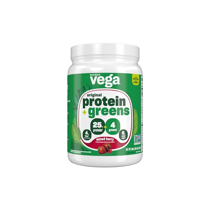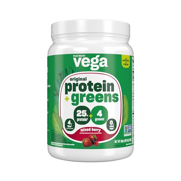 Introducing our new and improved Protein & Greens, now with more protein and fiber! Each scoop is stacked with kale, alfalfa, broccoli and spinach, plus 25g of plant-based protein and 4g of fiber. Start your day with plants by shaking up one serving of Vega Protein and Greens with 1 ? cups of ice water or blend a scoop into your favorite smoothie recipe for a smooth, subtly sweet taste. Try Vega Protein & Greens in delicious Vanilla, Chocolate or Berry. Vega Protein and Greens is non-GMO Project Verified, Vegan certified, B Corp Certified, and gluten-free with no added sugar, artificial flavours, or preservatives.