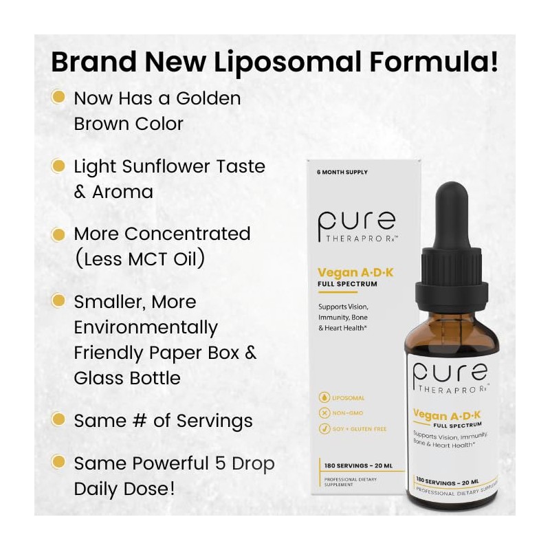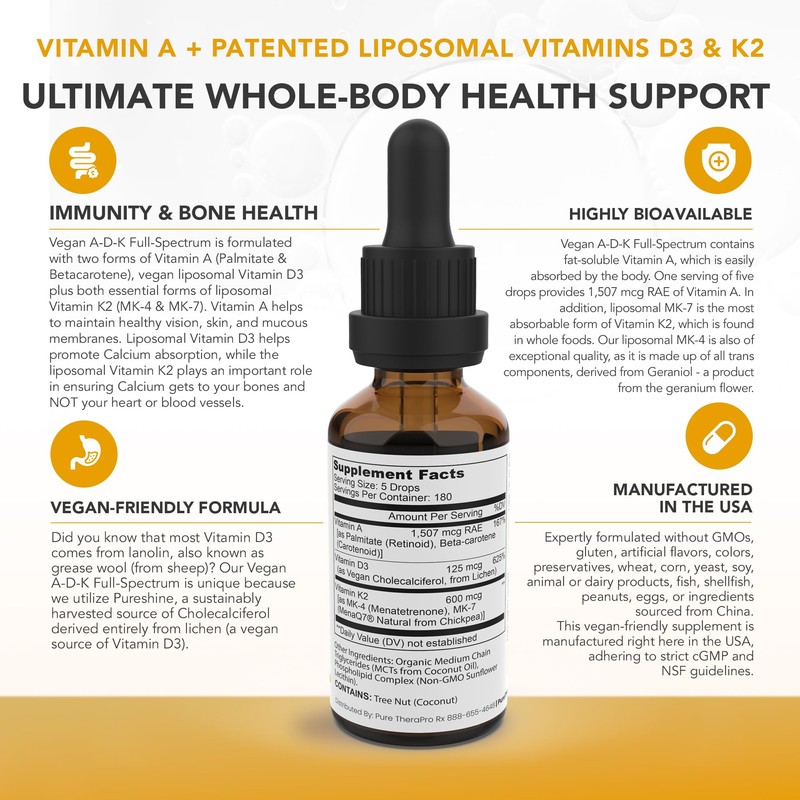 Pure TheraPro Rx Vegan A-D-K Drops - 6 Month Supply - Vitamin A (Palmitate & Betacarotene), Liposomal Vitamin D3 (Pureshine), Liposomal Vitamin K2 (MK-4 & MK-7) Supports Immunity & Bone Health - 20 mL