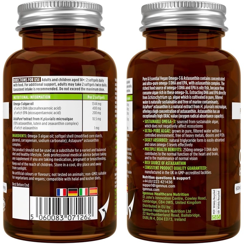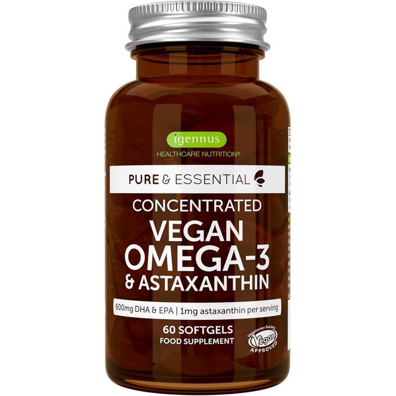Vegan DHA & EPA Omega 3 Algae Oil & Astaxanthin Antioxidant, 1344mg Omega 3, Pure & Sustainable, 60 Small Softgels, 400mg DHA & 200mg EPA, Clean Label, Easy-to-Swallow, 30 Servings, by Igennus