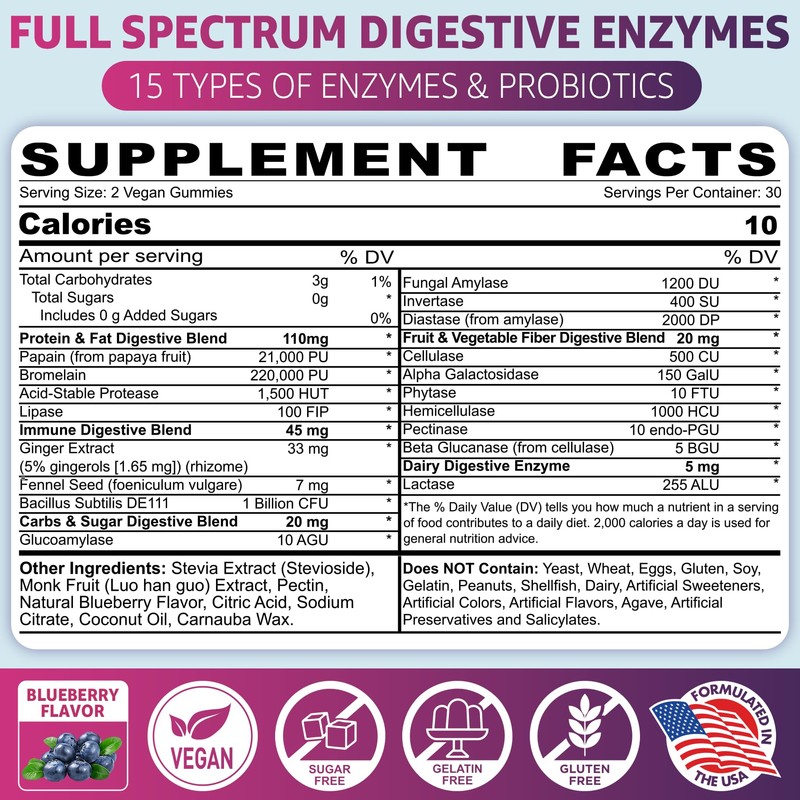 Fast-Acting, 30-Minute Debloat Formula: Say goodbye to bloating within 30 minutes with our blend of 15 essential digestive enzymes like protease, lipase, papain, bromelain, lactase, invertase, cellulase, and pectinase. Combined with probiotics, ginger, and fennel seed, these gummies help break down proteins, carbs, fats, fruits, vegetable fiber, sugars, and dairy products for better nutrient absorption, smoother digestion, and bloating relief—your new meal time hack!